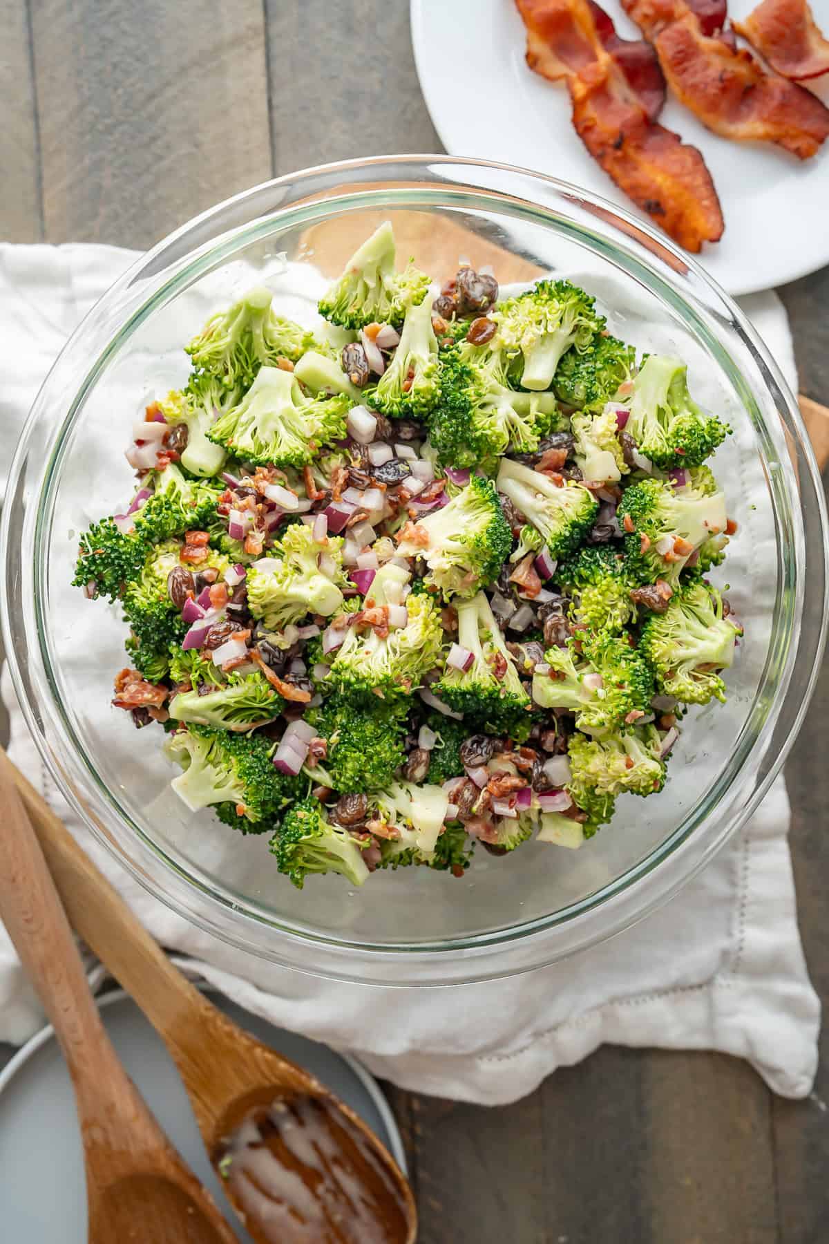This broccoli raisin salad with bacon is most popular in the summer for picnics, potlucks, or barbecues. It's also a popular side dish for Easter or Thanksgiving (using dried cranberries instead of raisins).
