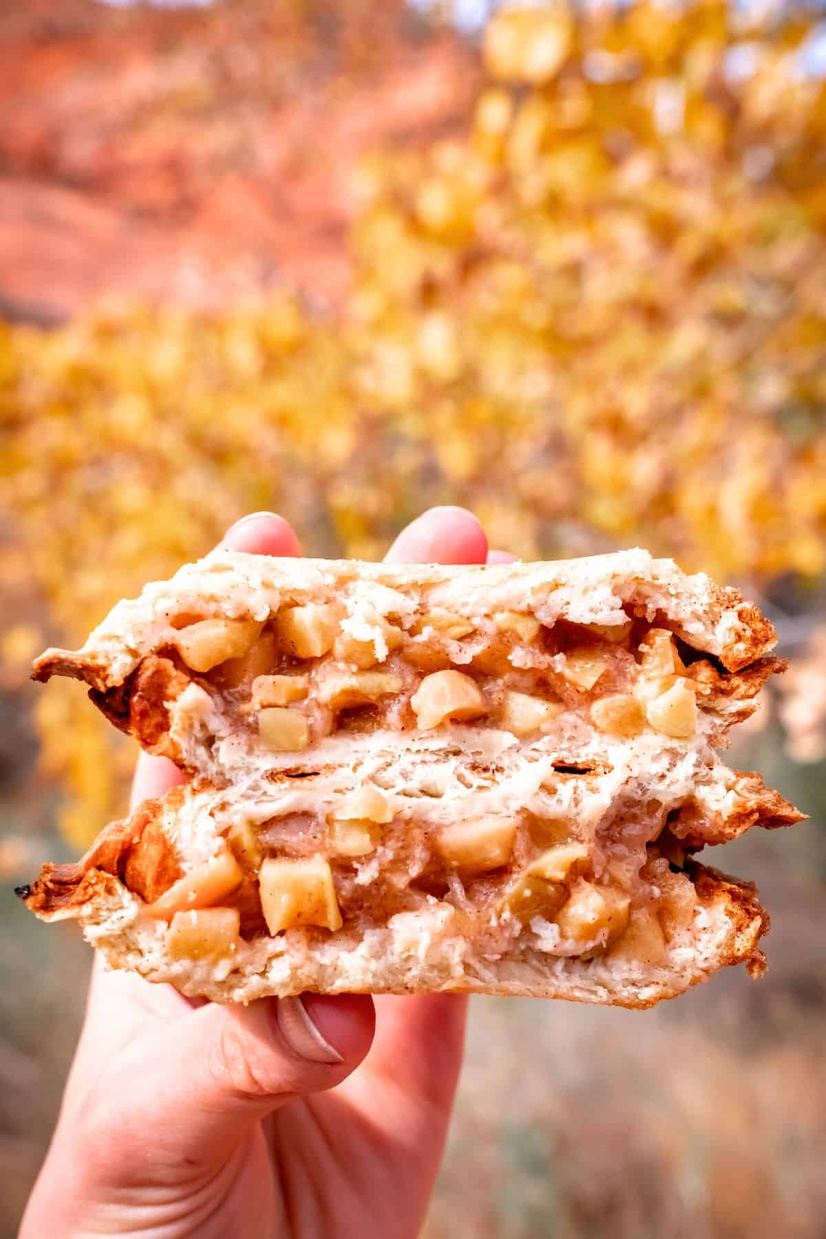 This pie iron apple pie recipe is inspired by the many food adventures I had in my Vanlife Kitchen! I lived and traveled in a camper van from late 2019 through to 2022, and many of my recipes were first created on the road. It's the easiest way to make a campfire apple pie and tastes a lot like the real thing -- even without the 'traditional' pie crust.